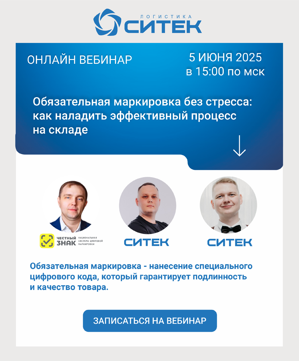 5 июня в 15:00 (мск) состоится онлайн вебинар на тему «Обязательная маркировка без стресса: как наладить эффективный процесс на складе». Участие в вебинаре бесплатное, необходимо предварительно зарегистрироваться на сайте. Ведущие вебинара: ✅ Николай Денисов, ведущий технический руководитель проектов, эксперт из системы «Честный знак»; ✅ Роман Фёдоров, старший руководитель проектов компании СИТЕК; ✅ Евгений Кривошеин, главный специалист отдела внедрения компании СИТЕК. Эксперты, знающие всё об обязательной маркировке: 🌀 Разберут подходы к организации обмена данными с «Честным знаком» и обсудят законодательство и грядущие изменения в системе; 🌀 Поговорят о цифровой маркировке: что важно знать всем; 🌀 Расскажут, как WMS работает с кодами маркировки; 🌀 Покажут процесс приёмки товаров с цифровыми кодами; 🌀 Разъяснят агрегацию цифровых кодов; 🌀 Рассмотрят работу с кодами маркировки при отборе, упаковке и отгрузке. Онлайн вебинар на тему «Обязательная маркировка без стресса: как налади