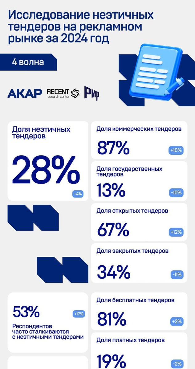 Почти треть рекламных тендеров — фейковые. Почему проблема остаётся нерешённой? В 2024 году 28% тендеров на рекламном рынке оказались неэтичными — это почти каждый третий конкурс, в котором агентства участвовали впустую. Их идеи использовали без контракта, критерии выбора были непрозрачны, а обратная связь — нулевая. Что показало исследование АКАР и АЦ РИР: — 53% агентств регулярно сталкиваются с фейковыми тендерами — 74% не получают обратной связи — 66% отмечают демпинг и участие неквалифицированных подрядчиков — Половина респондентов понесли финансовый ущерб, у трети — убытки до 20 млн рублей — Только 29% смогли добиться компенсации или наказания нечестного организатора Зачем устраивают фейковые конкурсы? Чтобы собрать идеи бесплатно или «обосновать» уже принятого подрядчика. Екатерина Селявина, сопредседатель Комиссии по этике АКАР: «Индустрия вступает в фазу зрелости — агентства не молчат, фиксируют ущерб, подают в суд и создают черные списки. Это даёт надежду». Комиссия