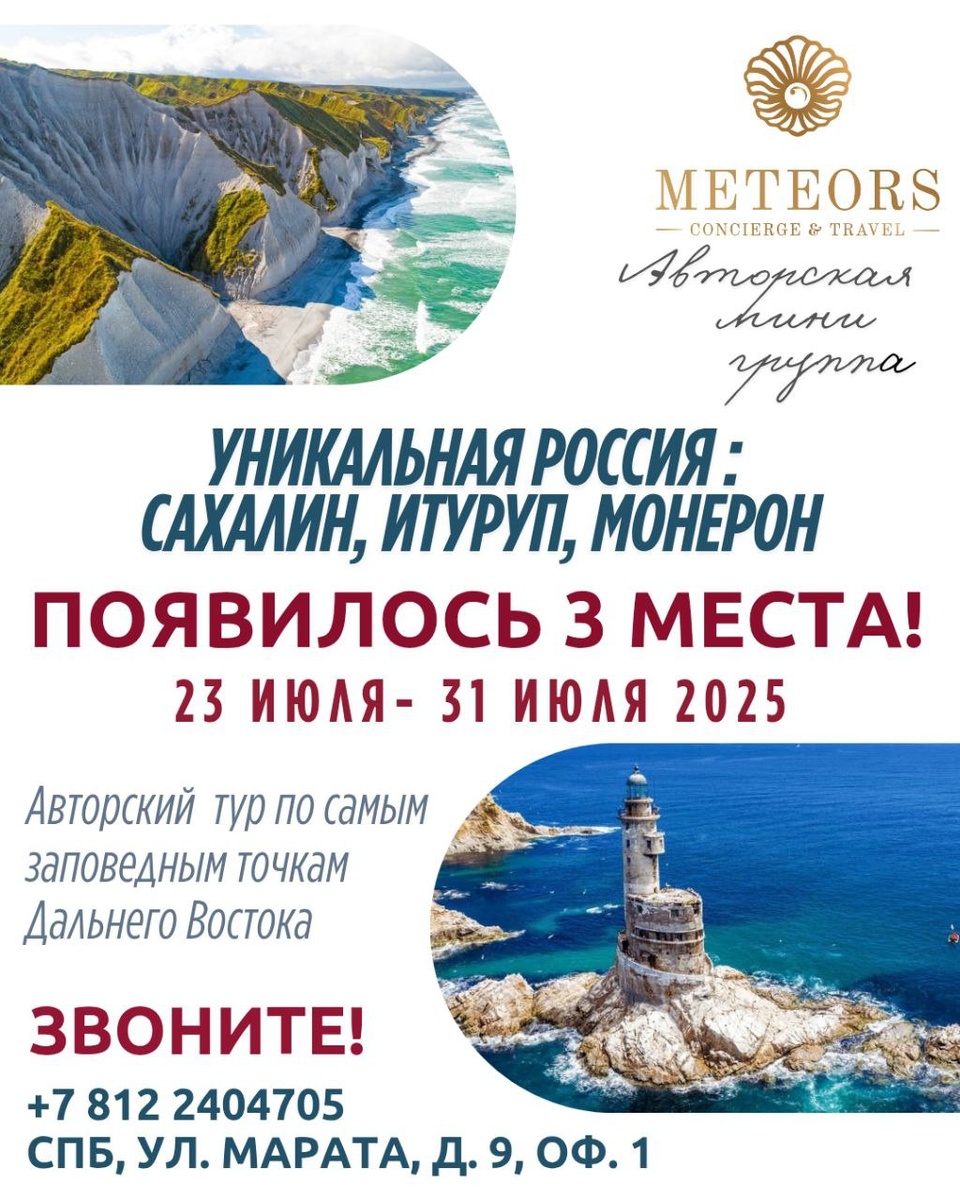 ⚡️ВНИМАНИЕ ! Появилось 3 места! В нашем уникальном авторском туре Сахалин – Итуруп - Монерон Появились 3 места в мини группе! 🔥 Мы отправимся в замечательный тур по трем незабываемым островам : - самый большой - Сахалин с его бухтами, маяками и устрицами, -уникальный нетронутый остров-природный парк - Монерон, -самый большой и невероятный остров южно-курильский гряды - Итуруп ✅ Наш маршрут : о.Сахалин (4 ночи)→о.Итуруп (3 ночи) → о.Монерон ✅ Даты : 23 июля — 31 июля 2025 ✅ Статус | Появились 3 места! ⚡️ ✅ 244500 р. + авиа ( от 27000 р) ✅ Транспорт : класса комфорт для нашей группы минивен , катера, джипы ✅ Гиды : опытные русскоговорящие гиды – инструктора по всему маршруту ✅ Выездной Кейтеринг ✅ Проживание в комфортабельных отелях ✅ Сопровождающий от нашей компании 🎤Звоните! Гарантируем, это отличная возможность украсить свое дело незабываемыми путешествием! Связаться с нами можно: 📍По телефонам: +7(812) 2404705 +79213591558 Куратор Абилова Мария, Лебедева Вера