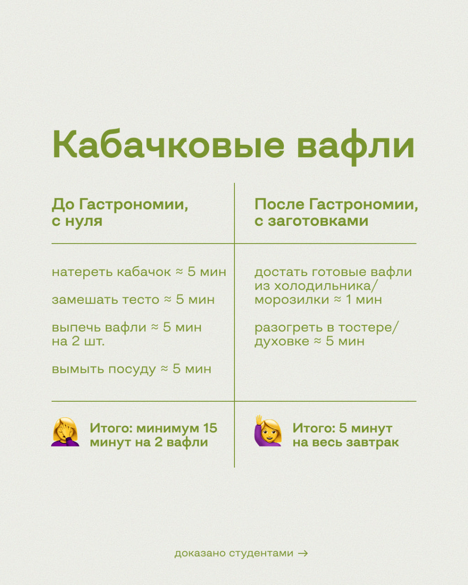 Мы с командой провели небольшой опрос среди подписчиков, и я была в шоке: Почти половина из вас готовит с нуля каждый день! Серьезно? Откуда столько дополнительных часов в сутках? Хочу показать на примере рациона из 3 блюд, сколько времени может освободиться, если использовать заготовки. Все цифры реальны и основаны на отзывах студентов 8 потока базового кулинарного курса «Гастрономия». Завтрак: кабачковые вафли Обед: борщ Ужин: ребра барбекю «Вы забыли посчитать время на заготовки!» — скажете вы. Если освоить системный подход на кухне, на заготовку 1 приема пищи будет уходить в среднем 4 минуты. Откуда взялись эти 4 минуты? Давайте считать⤵ После освоения всех модулей Гастрономии и отработки навыков, выпускнику требуется около 2 часов, чтобы сделать заготовки на неделю. ✨на 2 недели — 2-4 часа. ✨на месяц — 6 часов. 6 часов = это 360 минут на 30 дней. В 30 днях есть 90 полноценных порций блюд. 360 минут = 90 порций Значит, на заготовку одной порции уходит 4 минуты активного времени