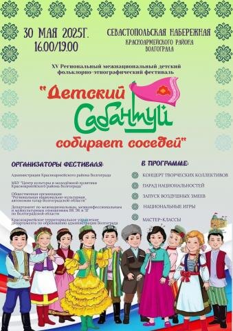 В канун Дня защиты детей, 30 мая, в Красноармейском районе Волгограда пройдет XV межнациональный детский фольклорно-этнографический фестиваль «Детский Сабантуй собирает соседей». Гостей и участников ждут на Севастопольской набережной. В программе — выступление творческих коллективов. В рамках юбилейного фестиваля состоится запуск воздушных змеев, изготовленных участниками. Стоит отметить, что мероприятие проводится для сохранения национальных традиций, пропаганды семейных ценностей, развития детского и молодёжного творчества. Его организаторами являются администрация Красноармейского района Волгограда и районный Центр культуры и молодёжной политики при поддержке профильных ведомств района и общественных организаций. Праздник пройдет с 16:00 до 19:00. К участию в конкурсной программе приглашаются детские, подростковые и молодёжные творческие коллективы, а также индивидуальные исполнители. Продемонстрировать свои таланты можно в нескольких номинациях: «Национальная эстрада» (песня, танец