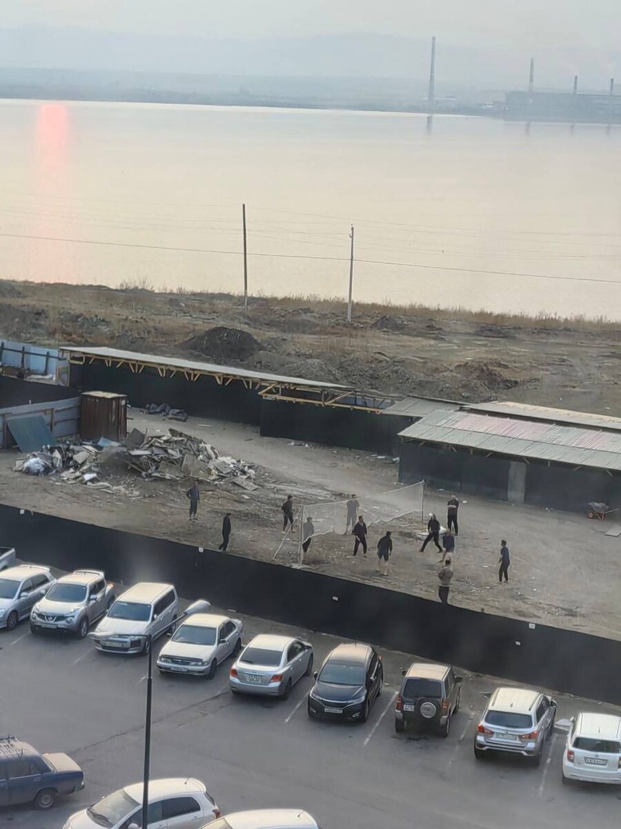 Фото, заряженное на улыбку: строители после рабочего дня играют в волейбол на закате.