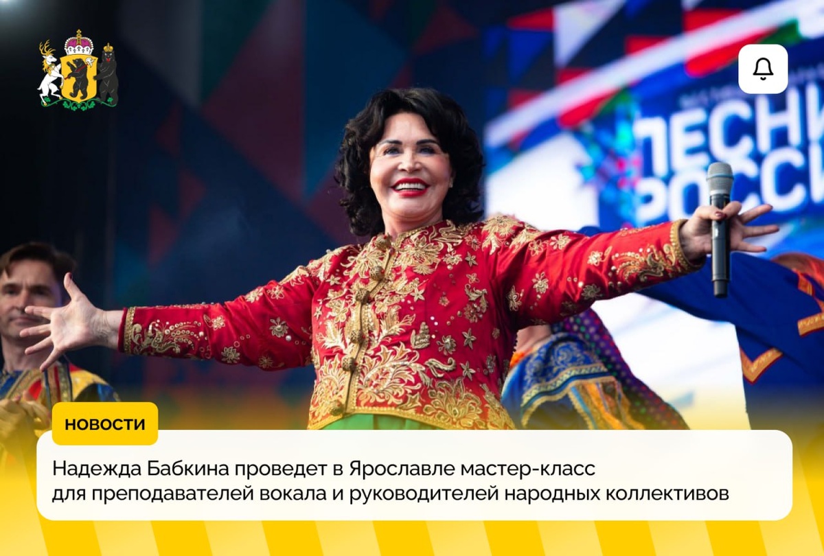 Надежда Бабкина проведёт мастер-класс в Ярославле 25 мая в Концертно-зрелищном центре Ярославля народная артистка России Надежда Бабкина и солисты ансамбля «Русская песня» проведут бесплатный мастер-класс. Мероприятие предназначено для преподавателей вокала, руководителей народных коллективов, студентов творческих специальностей и специалистов домов культуры. Мастер-класс пройдёт в рамках проекта «Модно-народно», который реализует благотворительный фонд «Народная певческая культура» при поддержке Президентского фонда культурных инициатив. Участники узнают, как сохранить актуальность народной музыки и танца в современном мире, а также познакомятся с традициями, символами и образами в народной песне. Для посещения необходима регистрация на сайте КЗЦ.🎶
