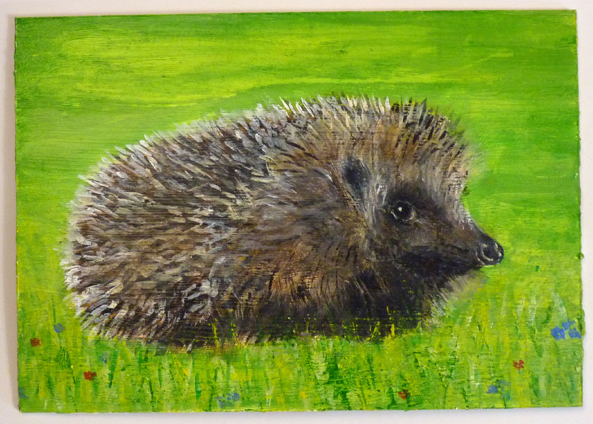 Картина "Ёжик", акрил, ДВП, размеры полотна 29х17 см. 2025 год.