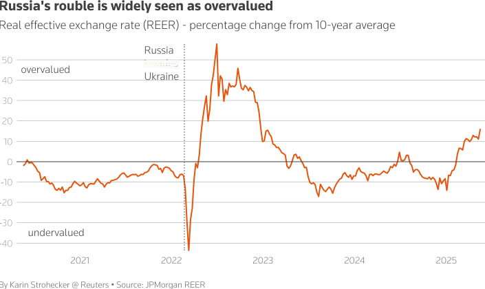 Рубль вырос примерно на 42% по отношению к доллару до 79 в четверг. Аналитики широко считают его переоцененным и называют провал мирных переговоров по Украине, возможное снижение процентной ставки, новые санкции и дальнейшее падение цен на нефть вероятными причинами спада. Высокопоставленный источник в правительстве, говоривший на условиях анонимности, сообщил, что существует широкий интерес к более слабому рублю, возможно, на уровне около 100 за доллар, при условии,