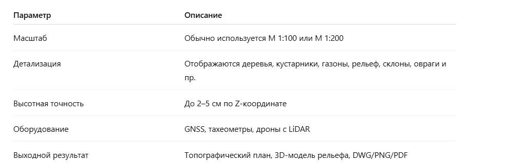 ⚠️ Отличие от классической топосъемки — повышенная точность и внимание к рельефу, а также необходимость согласования с ландшафтным дизайнером.