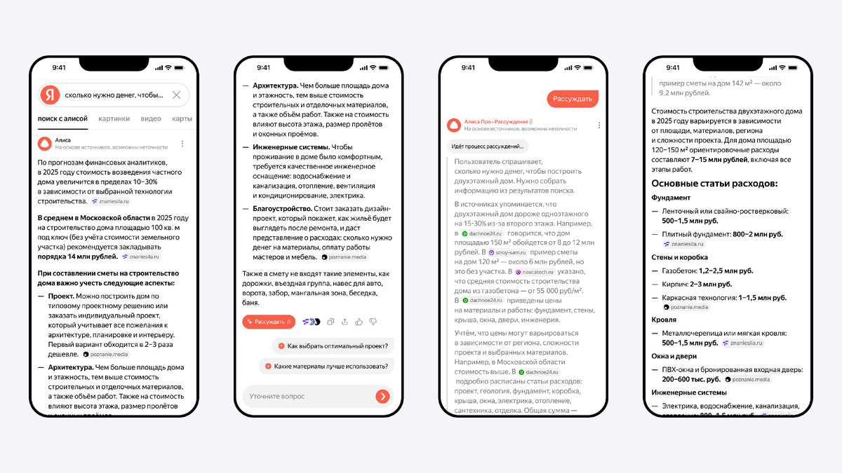 В «Поиске» от «Яндекса» появился режим «Рассуждений» и возможность генерировать тексты и изображения — прямо в поисковой строке. За новыми функциями стоит нейросеть «Алисы», которая расширила возможности прежней системы «Нейро». По запросу вроде «морские узлы» пользователь получит не просто краткое определение, а структурированный материал с подзаголовками, схемами, видео и ссылками. Подходит для сложных задач: например, составить смету на строительство или сравнить характеристики техники. «Алиса» подключает больше источников и оформляет ответ в виде таблиц или аналитики. Активируется кнопкой «Рассуждать» под ответом. Можно попросить: «Напиши пост про загородную жизнь» или «Нарисуй картинку для презентации». Всё работает прямо из «Поиска». «Алиса» подсказывает, как выбрать технику или инструмент, объясняет ключевые характеристики и сценарии использования. Новый поиск работает не только на странице «Поиска», но и по всему «Яндекс Браузеру»: можно задать вопрос по любой открытой страни