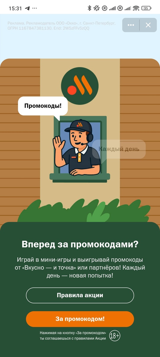 В ВК появилась игра от вкусно и точка. Можно выиграть купоны на напитки или бургеры за рубль. Ссылка на игру будет в конце статьи. Переходим по ссылке и нажимаем за промокодом. У нас появится девушка, которая едет на велосипеде до вкусно и точка. Затем нам предложат из двух пакетиков выбрать любой, в одном есть промокод либо на скидку, либо на товар за рубль. Промокоды полученные игре действуют аж до 20 июня. Играть можно один раз в день. Что выпало вам? Хвалитесь !) Ссылка на игру