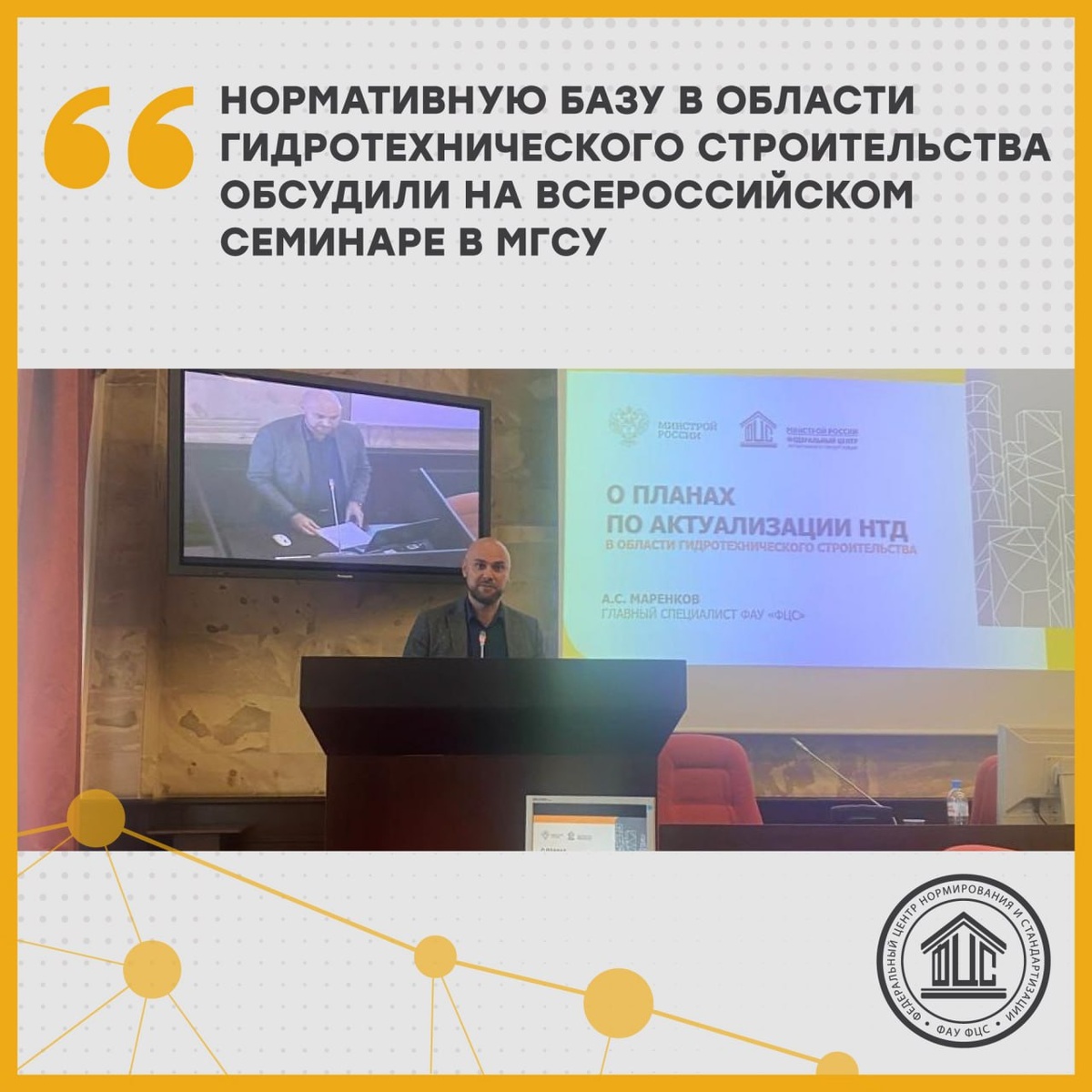 ⚡️VIII Всероссийский научно-практический семинар «Современные проблемы гидравлики и гидротехнического строительства» прошел в МГСУ 21 мая с участием ФАУ «ФЦС». 🤝 На площадке семинара эксперты обсуждали вопросы гидротехнического и гидроэнергетического строительства, а также инженерной гидрологии и водного хозяйства. 🇷🇺 Главный специалист Управления нормирования и стандартизации ФАУ «ФЦС» Александр Маренков рассказал о планах по актуализации нормативных технических документов в области гидротехнического строительства. ❗️ Спикер напомнил, что в 2024 году ФАУ «ФЦС» было организовано проведение прикладного научного исследования «Мониторинг и анализ действующих нормативных документов по проектированию, строительству, ремонту, реконструкции и эксплуатации гидротехнических сооружений» с целью определения необходимого объема работы с документами, требующими актуализации. «Актуальность исследования обусловлена необходимостью отражения и учета в нормативной технической документации по гид