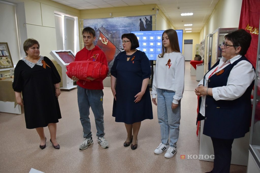 В ходе мероприятия активисты Движения Первых вместе со своим руководителем И. Бронниковой передали на хранение в музей «Полотно Победы-2025» размером 10х3 м, собранное в этом году в рамках акции, объявленной врио губернатора Юрием Слюсарем. Принимая ценный подарок, А. Шеневская отметила, что ровно 15 лет назад, в 2010 году, такое же полотно было собрано активистами юношеского движения ЦВР, с той лишь разницей, что на лоскутах ткани алого цвета были записаны пожелания еще при жизни ветеранов войны — П.А. Батырева, М.И. Шевелевой, П.П. Гридина и других. И чаще всего встречалось одно: чтобы никогда не было войны.