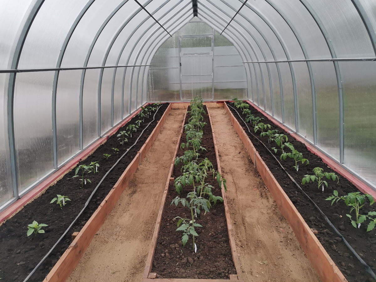 В последнее время я не успеваю вам ничего рассказывать и показывать. Но лучше поздно, чём никогда. Итак, 18 и 20 мая, как и планировала, высадила помидоры и перцы в теплицы. У меня 2 теплицы под помидоры, они находятся на разных участках, по форме и расположению грядок они отличаются друг от друга. Первая - капелька 8 на 3 метра, в ней 3 грядки, по краям широкие, в центре узкая. С одной стороны я высадила перцы, с другой стороны и по центру помидоры. Вторая -прямостенная 8 на 3 метра, грядки шириной 90 см сделали с двух сторон, по центру широкий проход. В этой теплице растут только томаты. Расстояние между томатами 40 см. В одной теплице они растут в одну линию, в другой зигзагом. В лунки добавляла перепревший конский навоз. Лунки перед высадкой хорошо пролила водой, после высадки тоже полила. Мои теплицы служат мне в первую очередь для выращивания рассады. У меня очень много овощной и цветочной рассады, выращиваю не только для себя, но и для друзей и родственников. Дома разм