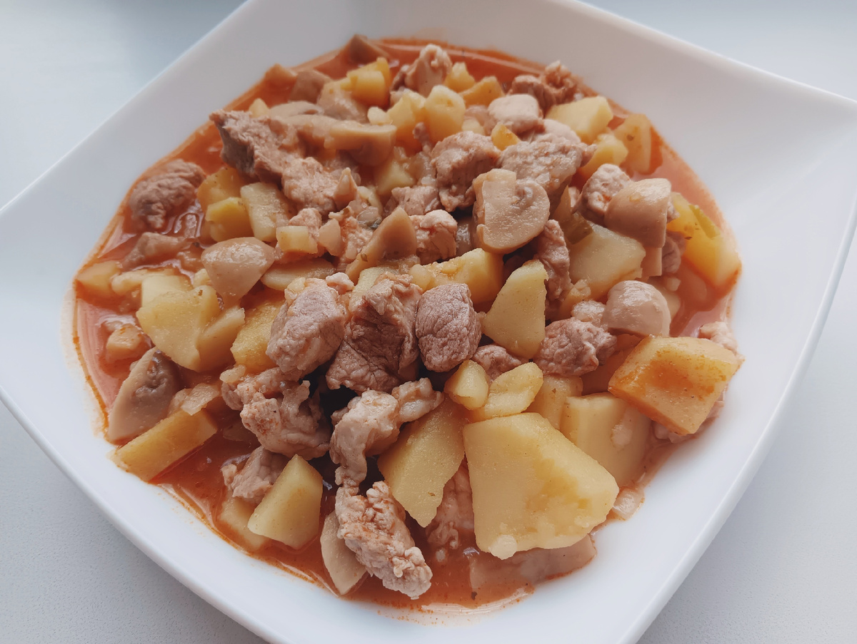 Решила сегодня себя побаловать и сделала жаркое со свининой и грибами. Рецепт я нашла на упаковке "Заправки для солянки" от Maggi. 1. Измельчила мясо на кусочки среднего размера. 2. Лук нарезала полукольцами. 3. Перекладываю мясо и лук в большой сотейник и обжариваю 5 минут на большом огне. Не забываем подсаливать по вкусу. 4. Пока мясо готовилось, я нарезала картофель, а затем отправила его в сотейник. Так же обжариваем 5 минут. 5. Нарезала грибы. 6. Отправляем грибы к картошке и мясу. 7. Вливаем воду (500мл), добавляем заправку и солим по вкусу. Жаркое сразу приобретает аппетитный вид. Тушила я не 30 минут, как написано на упаковке, а 45 минут. Жаркое получилось невероятно ароматным и очень сытным. Целый сотейник. Подача может быть дополнена свежей зеленью, например, укропом или петрушкой, а также можно добавить немного сметаны для более нежной консистенции. Простой и быстрый рецепт: нарезала ингредиенты, добавила заправку — и готово! Рекомендую! Если понравилась статья или было п