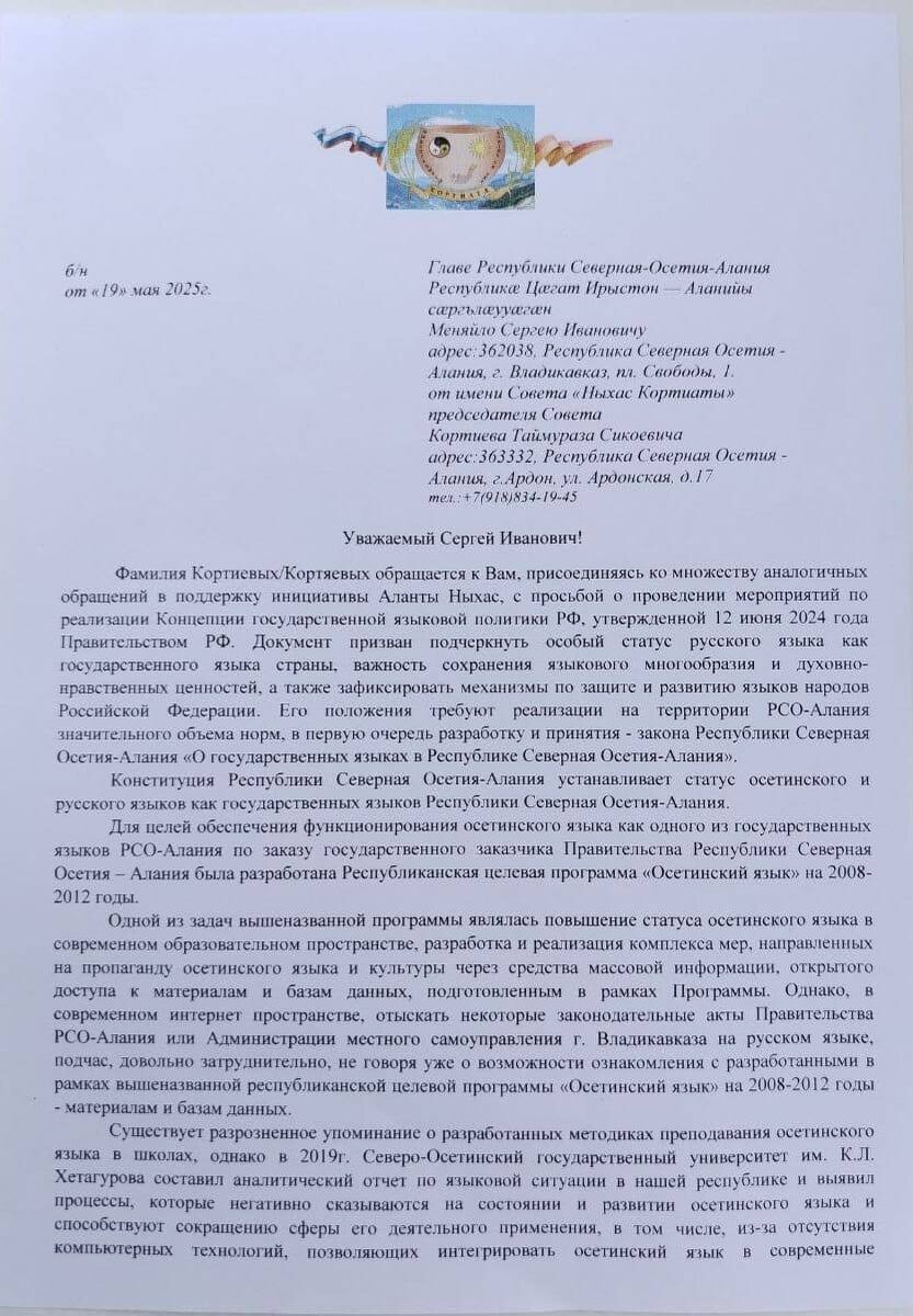 Хотя глава Северной Осетии объявил о возвращении к работе над законом о государственных языках после 11-летнего затишья, фамильные советы не прекращают направлять обращения на его имя. «Поступило обращение фамилии Кортиатæ (Кортиевы). Публикуем. Кортиатæ, фидар ут æмæ уын бузныг» (@alania_sacral)
