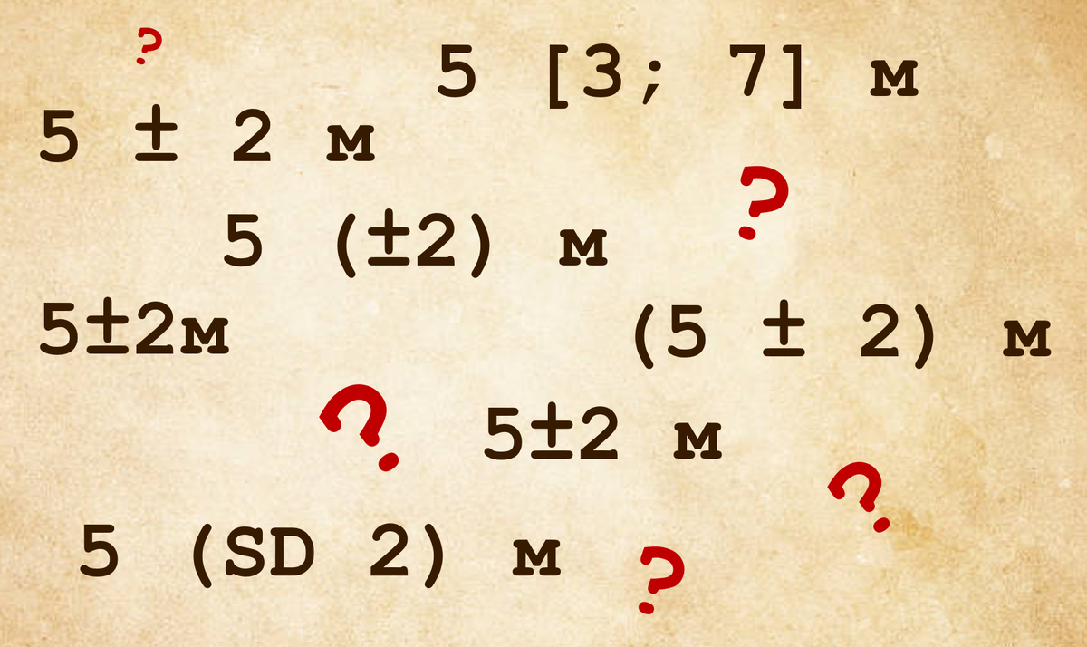 Допустим, вам нужно записать арифметическое среднее (µ = 5) и стандартное отклонение (SD = 2). Какой из вариантов записи правильный: "5±2 м", "5 ± 2 м", "(5 ± 2) м", "5 (±2) м", "5 [3; 7] м"? По моим наблюдениям, в точности этого не знает никто. Проблема усугубляется тем, что на те ГОСТы, где это хоть как-то прописано, либо нет ссылки, либо ссылка есть, но на ту версию, где это не указано. Например, ГОСТ Р 1.5 версии 2002 года содержит информацию о способе записи предельных отклонений (п. 4.15.6), но требования, регламентирующие оформление диссертации и научного отчёта, ссылаются только на более поздние версии 2004 и 2011 года. То ли кто-то что-то напутал, то ли не предусмотрел. Дело ясное, что дело тёмное. Теперь без лишних подробностей хочу поделиться основными результатами своего небольшого расследования. Принцип был следующий: если прямой ссылки на ГОСТ нет, но есть такой, в котором прописано искомое правило, то лучше учитывать его. Потому что бывает, что те, кто оценивают вашу р