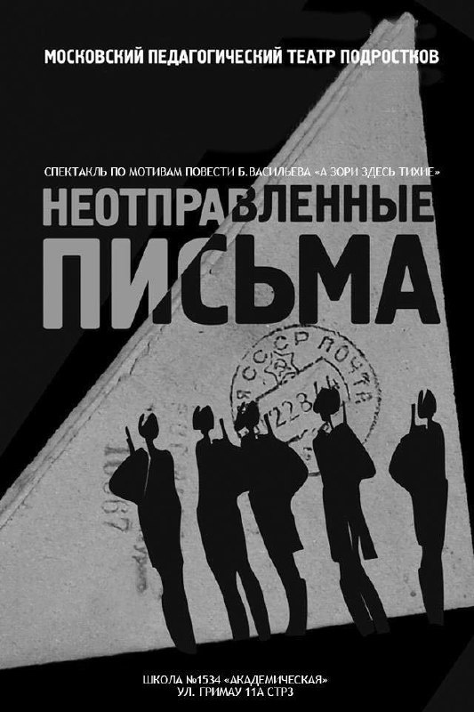 Премьера! ✉️Московский педагогический театр подростков представляет спектакль «Неотправленные письма» по мотивам повести Бориса Васильева «А зори здесь тихие» Показы состоятся 30 и 31 мая! 30 мая в 18:00 31 мая в 16:00 📍Адрес: Ул. Гримау 11а строение 3, актовый зал Школа № 1534 «Академическая» Ссылки для регистрации: 30 мая: https://teatr-podrostkov.timepad.ru/event/3376282/ 31 мая: https://teatr-podrostkov.timepad.ru/event/3376439/ Регистрируйтесь и приходите! #школа1534 #донм #таланты1534 #ТалантливыеДетиМосквы