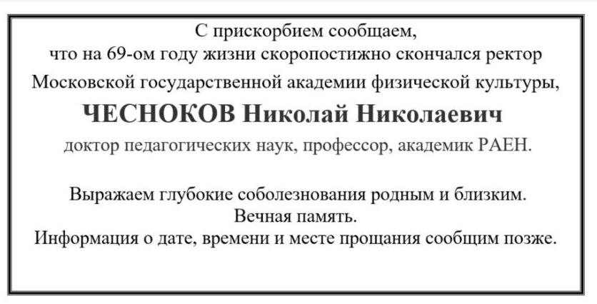 — Министерство спорта России и коллектив Академии выражает соболезнования родным и близким Николая Николаевича. По словам коллег, Николай Чесноков запомнился им настоящим профессионалом своего дела, управленцем высокого класса и авторитетным ученым. Николай Николаевич был доктором педагогических наук, заслуженным работником высшей школы РФ и мастером спорта СССР по легкой атлетике.