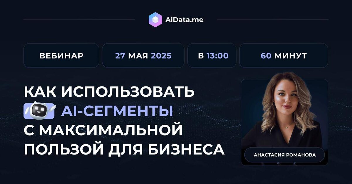 Пользователей много — но кто из них ваш? Пока одни бренды тратят бюджеты на широкие охваты, другие точно знают, кому и когда показывать своё предложение — и получают x2 к результатам. 27 мая AiData проведёт вебинар о том, как использовать готовые AI-аудитории с максимальной пользой для бизнеса: 🎯 Как находить нужную аудиторию без лишних тестов и гипотез. 📈 В чём сила AI-сегментов и как они помогают экономить бюджет. 📊 Примеры из разных отраслей: ecom, авто, недвижимость и не только. Участие бесплатное, но количество мест ограничено. Зарегистрироваться по ссылке. Реклама, ООО «1001101», ИНН 7726472670 erid: 2W5zFJNT9uS
