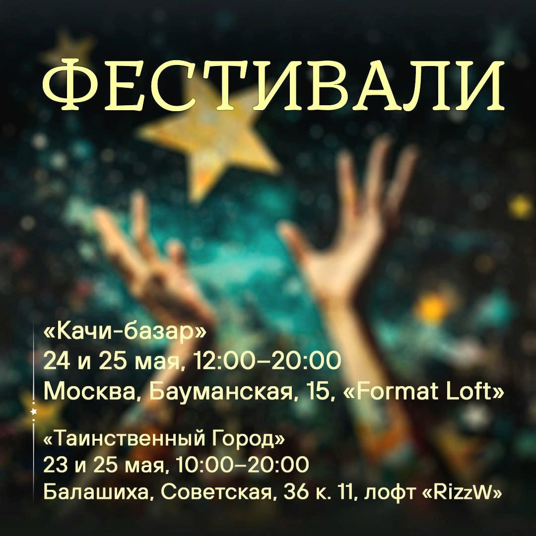 ☀️ Скоро лето, а где же тепло? Пасмурно и ни одного солнечного лучика? Зато Лучистые люди у нас есть всегда! Мы не ждём, когда погода изменится, а делаем её сами. Едем на фестивали к созвучным людям рассказывать о Лучах миссии и приглашаем вас! ✨ Дриада Лийя и команда мастеров Луча будут на бохо-маркете «Качи-базар» в Москве и на эзотерическом фестивале «Таинственный Город» в Балашихе уже на этих выходных. 🏺 «Качи-базар» — это знакомое многим уютное и атмосферное пространство, чудесные творческие люди и стиль настоящего волшебства. 🕯 А фестиваль «Таинственный Город», кстати, проводится впервые — и это здорово, что появилось ещё одно место, где люди объединены темой самопознания и реализации своего потенциала. Конечно же, мастера Луча с удовольствием присоединятся, чтобы определять Лучи миссии, а Дриада проведёт лекцию! 📚 Итак, где мы встречаемся на этих выходных: 🔠«Качи-базар» (бохо-маркет) 24 и 25 мая, с 12:00 до 20:00 Москва, ул. Бауманская, 15, подъезд 7 «Суздаль». Басм
