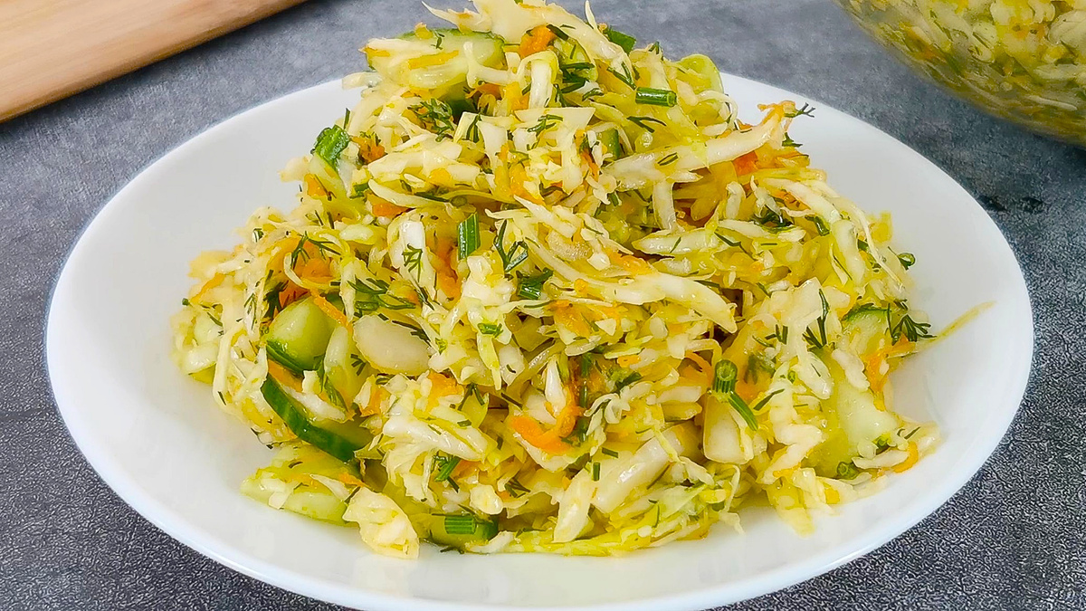 Салат с капустой - это не просто блюдо, а настоящая находка для тех, кто ценит свежесть и легкость в питании. Этот яркий и хрустящий салат станет отличным дополнением к любому столу, будь то праздничный ужин или обычный обед. Капуста, богатая витаминами и минералами, в сочетании с разнообразными овощами и заправками, создает гармоничное сочетание вкусов и текстур. Давайте вместе откроем секрет его приготовления! 1. Капусту нарезать тонкой соломкой и положить в большую салатницу. Руками размять капусту, чтобы она стала более мягкой. 2. Огурец нарезать четвертькружочками и отправить к капусте. 3. Репчатый лук нарезать четвертькольцами, а морковь натереть на мелкой терке и добавить в салатницу к остальным ингредиентам. 4. Мелко нарезать укроп. 5. Далее готовим заправку. В небольшую емкость наливаем столовый уксус 9%, добавляем соль, сахар, растительное масло и все хорошо перемешиваем. 6. Заправляем салат и хорошо перемешиваем. Также подписывайтесь на наш Телеграмм: Кулинарная поляна Там т