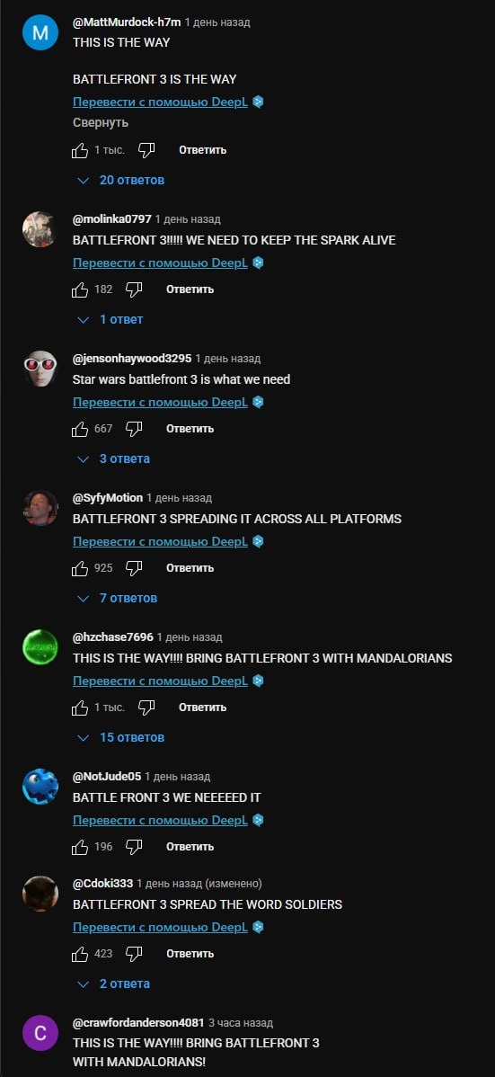 В ответ на пост Обстановка: люди хотят Star Wars: Battlefront 3. Под новым трейлером Fortnite к запуску обновления с мандалорцами примерно каждый 25-й комментарий про Fortnite, а остальные 24 комментария — про Battlefront 3.
