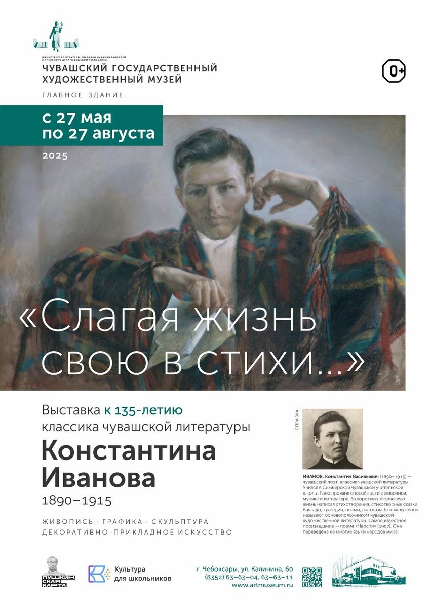 27 мая 2025 года начинает работать выставка, посвященная 135-летию со дня рождения классика чувашской литературы Константина Васильевича Иванова. В экспозиции будет представлено 30 произведений графики, живописи, скульптуры и декоративно-прикладного искусства из собрания Чувашского государственного художественного музея.