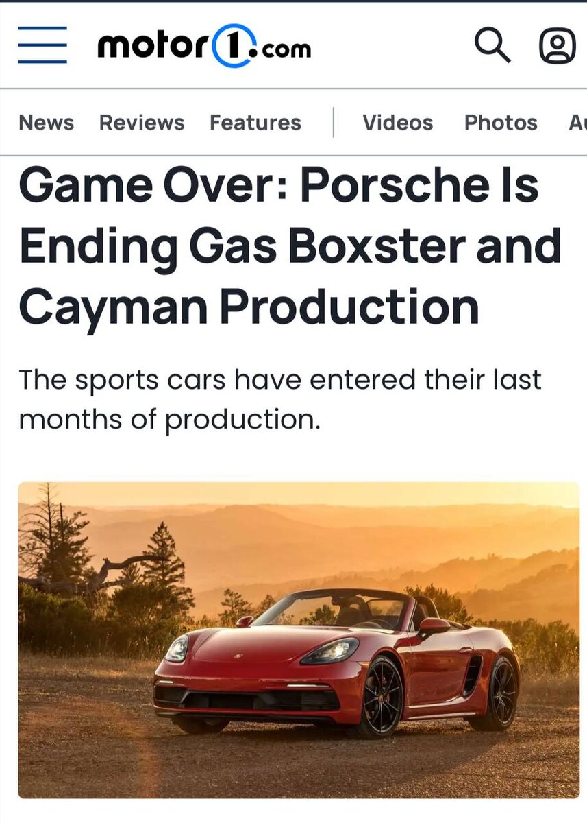 Porsche убивает бензиновые Boxster и Cayman — последние легендарные спорткары соберут в октябре. Европа уже попрощалась с ними из-за новых правил, теперь очередь за всем остальным миром. На замену придут эклектрокары. Porsche обещает сохранить динамику и мощность, но без двигателя внутреннего сгорания. При этом бренд не отказывается от бензиновых моделей в других моделях: Cayenne и Panamera продолжат работать на ДВС, а для Macan готовится новый бензиновый кроссовер.