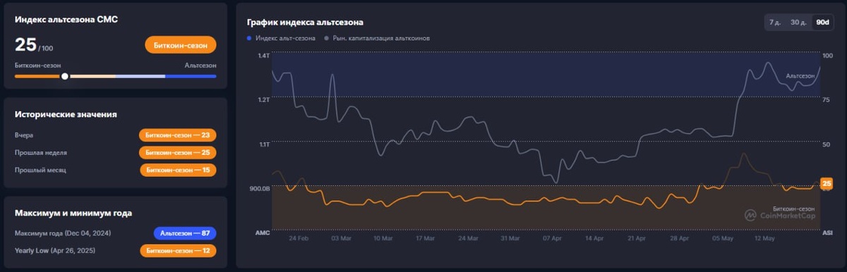 Анализ индекса альтсезона Текущее значение индекса 25 (Битомическая) – низкий уровень, что указывает на слабую активность альткойнов. 100 (Альтсезия) – максимальное значение, но текущий показатель (25) далек от него. Исторические данные Вчера и на прошлых неделях индекс оставался на уровне 25 (Битомическая). В прошлом месяце был ниже – 15 (Битомическая), что говорит о небольшом росте. Годовые экстремумы Максимум (Dec 04, 2024): 87 (Альтсезия) – сильный альтсезон. Минимум (Apr 26, 2025): 12 (Битомическая) – глубокий спад. График и динамика Индекс колеблется вблизи 1.11–1.41, без резких скачков. Капитализация альткойнов стабильна, но без явного роста. Вывод Рынок альткойнов находится в фазе низкой активности (Битомическая = 25). Для начала нового альтсезона нужен рост выше 50–60. Пока доминирует Bitcoin, а альткойны остаются в тени.