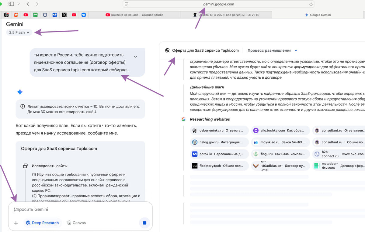 Есть такая функция как Deep Research у Gemini и она позволяет вам получить через 3-4 минуты детальный отчет по заданной теме. В моем случае мне нужно было сделать лицензионный договор для нашего сервиса tapki.com... Итог - документ в Google.Docs по заданной теме. Просто конфетка, читал и умилялся ... он учел ВСЕ возможные сценарии. Я не берусь судить про 100% юридическую чистоту документа, но это лучше, чем копировать у конкурента, не понимая откуда скопировал он :) p.s. бесплатно 10 отчетов в месяц - мне хватает :) Русский ИТ бизнес