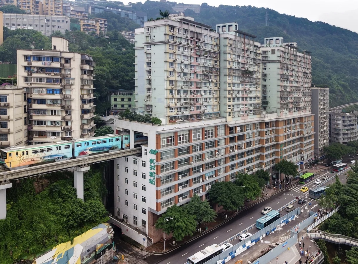Продолжаем рассказывать про город-феномен Чунцин, про необычные градостроительные особенности, которые делают его уникальным даже на фоне других китайских мегаполисов. Чунцин – это не просто крупнейший по площади и населению мегаполис Китая, а настоящая лаборатория урбанистических экспериментов. Здесь архитекторы и градостроители вынуждены искать нестандартные решения из-за сложного рельефа, нехватки земли и стремительного роста населения. В результате город превратился в место, где: Поезда метро проезжают сквозь жилые дома (Лицзяба). Парковки расположены на крышах зданий. Детские площадки встроены между эстакадами и на крышах домов. Реки меняют цвет из-за промышленных выбросов. Открытые общественные туалеты стали частью уличной культуры. Уникальная станция метро Лизиба (Liziba station), через которую поезд проходит насквозь, минуя 7-8 этажи 19-этажного жилого комплекса. Поезд не останавливается внутри здания. Станция расположена снаружи, но путь лежит через проем в д
