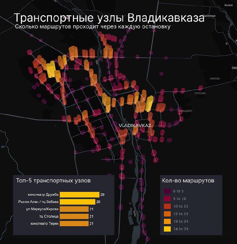 Весьма любопытная визуализация вышла у @irystories. В частности, видно, что главная транспортная артерия Владикавказа завязана на три-четыре условные «торговые зоны»: 1. Центральный рынок/ТЦ «Глобус»; 2. ТЦ «Забава»/ТЦ «Стэйтон»; 3. Рынок «Алан»/ТЦ «Столица» (+ зона «Чиба»/«Викалина»). (@Sidaemon)