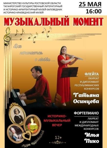 В воскресенье, 25 мая, в двусветном зале Историко-краеведческого музея (Дворца Алфераки) состоится программа «Музыкальный момент». Ценители инструментальной классики услышат самые популярные произведения отечественных и зарубежных композиторов XVIII-XX веков. Слух меломанов усладит музыка Иоганна Себастьяна Баха, Эдварда Грига, Франца Шуберта, Фредерика Шопена, Михаила Глинки, Николая Римского-Корсакова, Сергея Рахманинова. Кроме того, гости историко-музыкального вечера смогут познакомиться с историями любви гениальных композиторов к их музам, принять участие в викторине и получить призы. Шедевры классической музыки исполнят лауреат республиканских конкурсов, артист Таганрогского муниципального духового оркестра Татьяна Осинцева (флейта) и лауреат международных конкурсов, преподаватель и концертмейстер Таганрогского музыкального колледжа Илья Пико (фортепиано). В творческой биографии Татьяны Осинцевой – работа в эстрадно-симфоническом оркестре Азербайджанского радио и телевидения, в Аз