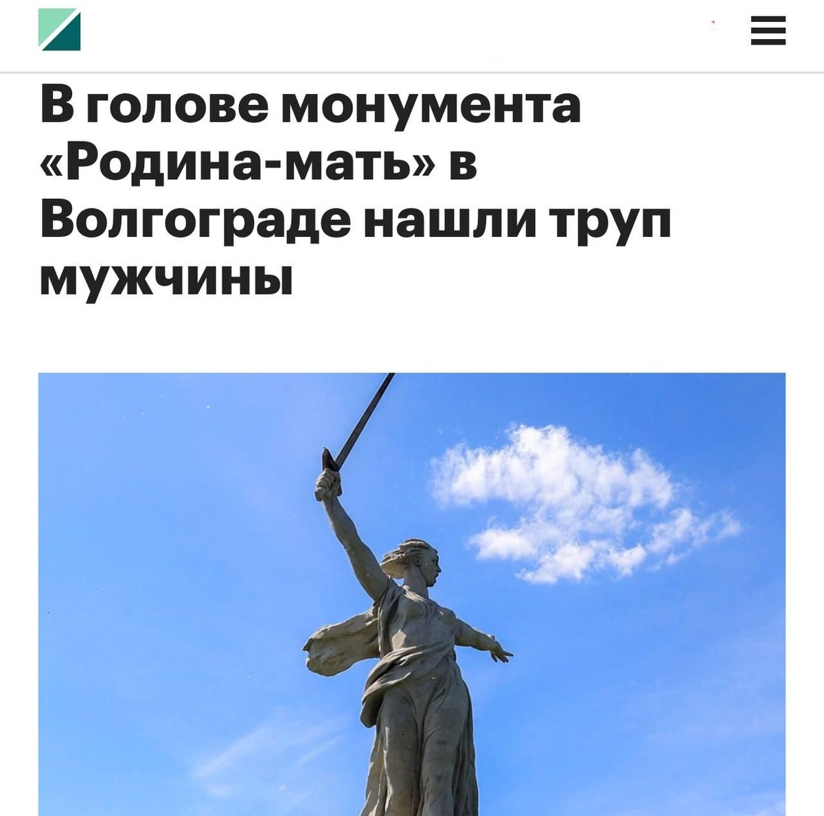 «В голове скульптуры на Мамаевом кургане нашли человеческое тело. Умерший являлся ректором одного из вузов. По предварительным данным, смерть мужчины не носит признаков криминального характера. Мужчине могло стать плохо во время экскурсии. Умершему — 58 лет. Туристам сообщают, что проход запрещен по техническим причинам.