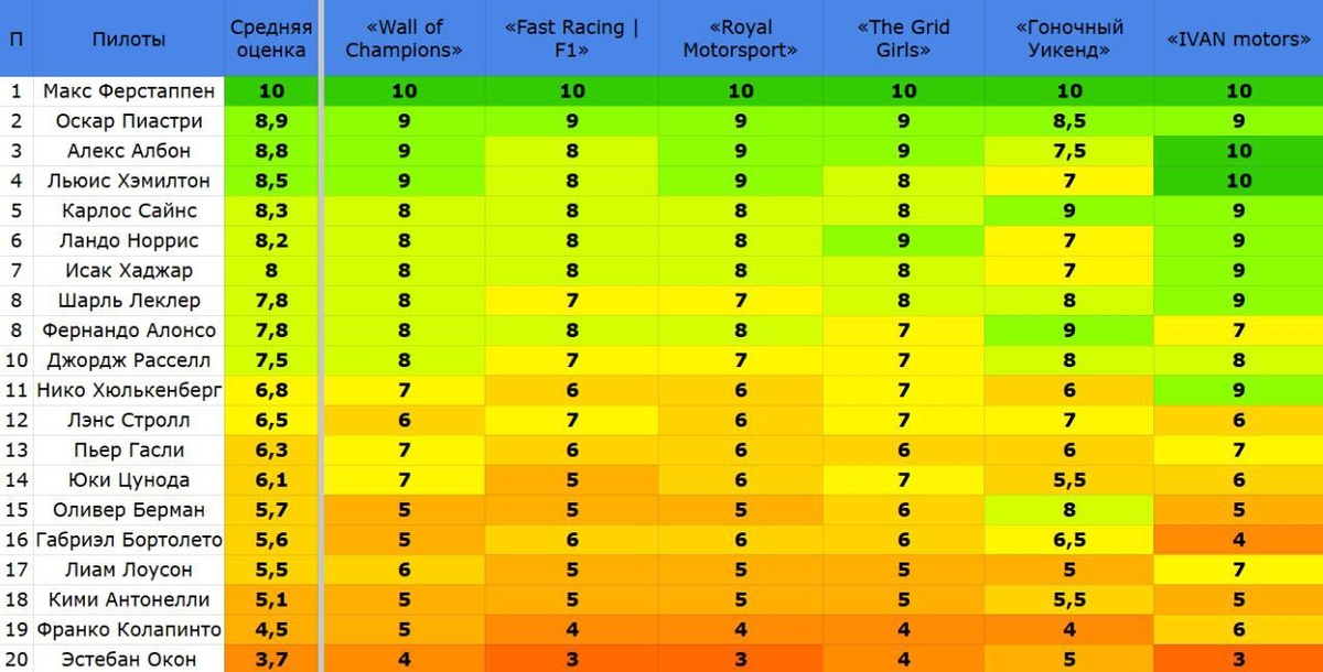 Запоздалые оценки гонщиков на гран-при Имолы: Гонку я смотрел в записи и хочу сказать, что Имолы мне может и не будет хватать визуально, но по гонкам на этой трассе я скучать не буду. Что касается оценок, то с таким обилием сейфети каров, ломающих стратегии, давать гонщикам объективные оценки проблематично. На этот раз лучшим стал Ферстаппен, который квалифицировался меньше чем в десятке от Пиастри и смог пройти его в первом же повороте. После чего уже болид позволил спокойно отрываться всю гонку и даже ск не смогли помешать одержать победу. Стоит обратить внимание на то, что в Имолу приехали новинки Ред Булла, завершающие весенний пакет обновлений, и мы действительно видим, что постепенно быки приблизились к Макларену, а это мы ещё не добрались до Испании, где гибкие крылья должны запретить. Например Мерседесы уже здесь тестировали более жесткие варианты, а Макларены будут использовать гибкость до последнего. Дальше идут 3 гонщика, получившие высокие оценки: Самый неудачливый гонщ