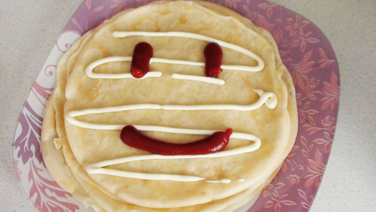 НАДО: Блин полить кетчупом и майонезом. Положить 2 колечка колбасы. Присыпать сыром. Свернуть треугольник. Обжарить с двух сторон на небольшом количестве масла до золотистого цвета. Жарить без крышки на среднем огне. Вкусный завтрак готов!) Обязательно попробуйте!)