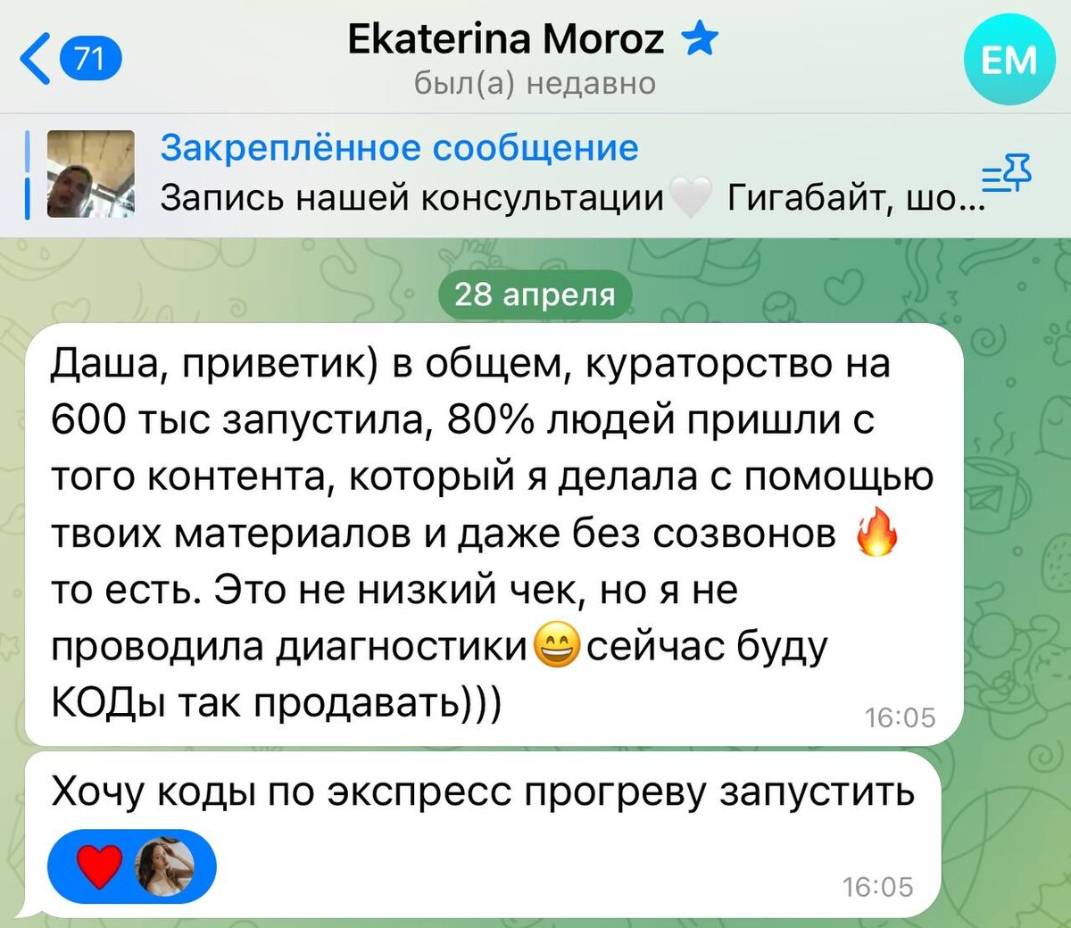 - узнавать о моих актуальных связках продаж для запусков на 500К+ в небольших каналах
