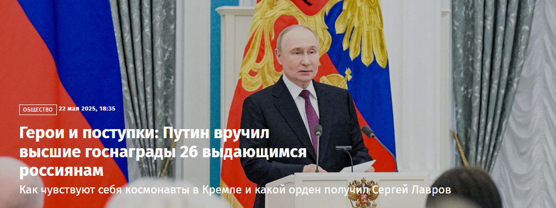 Владимир Путин вручил высшие государственные награды 26 выдающимся россиянам. 22 мая в Екатерининском зале Кремля ордена, медали и почетные звания получили военные, летчики-космонавты, многодетные мамы и государственные деятели, а также директора школ и заслуженные представители рабочих профессий. Президент отметил вклад каждого в общее дело страны: воспитание нового поколения и защиту интересов РФ. Награжденные же признавали: за полученными ими орденами и медалями практически всегда стоит работа целой команды. Кто в этот день получил звание Героя России и куда пригласили Владимира Путина — в материале «Известий».