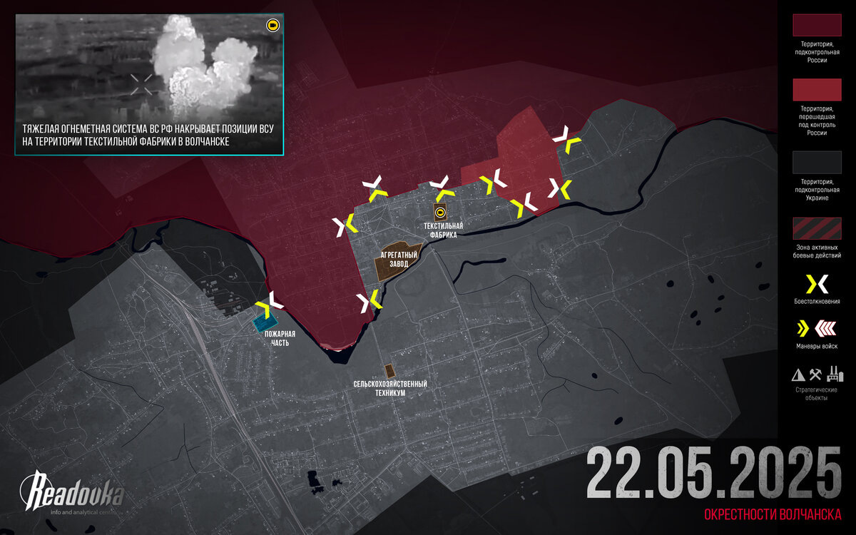 Редакция Readovka собрала ключевые события 22 мая в контексте СВО. Российские войска возобновили активные действия в Волчанске Харьковской области. В украинских источниках отмечаются значительные потери военных грузов на Покровском направлении, противник видит угрозу прорыва фронта и быстрой потери Покровска и Мирнограда..