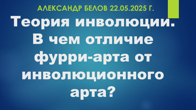 u Сторонники теории инволюции не согласны с эволюционной трактовкой трансформации мультяшных героев, а затем и героев фурри-комиксов. Они считают, что здесь имеет место инволюционный сценарий. Конечно, это лишь манифестация, надеемся, что никто из потребителей этой продукции и этого контента, не превратится в лису или волка, или в зайчонка и ягненка.