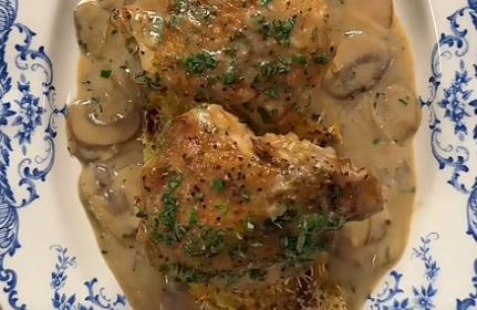 Иногда после долгого дня хочется по-настоящему домашнего ужина — не просто сытного, а согревающего душу. Такого, чтобы на кухне витал аромат чеснока и тимьяна, на плите булькало нечто сливочное и нежное, а из духовки доносился хруст запекающейся картошки. Именно таким рецептом я хочу с вами поделиться. Сегодня готовим куриные бедра в сливочном соусе с шампиньонами и белым вином. Это не просто блюдо — это маленький праздник вкуса. В качестве гарнира — золотистый бейби-картофель с сырной корочкой. Готовится легко, а выглядит как в ресторане. Начинаем с курицы. Бедра тщательно обсушиваем бумажным полотенцем — это важно для румяной корочки. Солим, перчим и отправляем на сковороду — сначала кожей вниз. Обжариваем по 5 минут с каждой стороны до аппетитного золотистого цвета. Убираем в сторону. В той же сковороде пассеруем мелко нарезанный лук и грибы около 10 минут, пока не испарится влага и не появится лёгкая карамелизация. Добавляем чеснок и тимьян — аромат на этом этапе будет просто вол