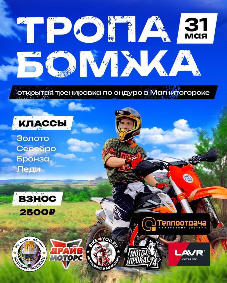 31 мая 2025 – Тропа бомжа Челябинская обл., г. Магнитогорск Классы Золото Серебро Бронза Леди Расписание 10:00 – начало Взнос – 2 500 р. на месте +500 р. Требования – 18+ – мед. справка – паспорт/св-во о рождении – страховка не менее 100 000 р. https://marshalone.ru/card/45c3ebb6-91fb-49a6-8346-bc74eb5dbdf0/ #LiteEnduroRussia #эндуро #мотокросс #dirtbike #enduro #moto #motorcycle #мотоспорт #мотоспортРоссии Motorcycle •[ЕКБ] МОТО• #мотосезон2025 #екатеринбург #ekbmoto #moto Источник