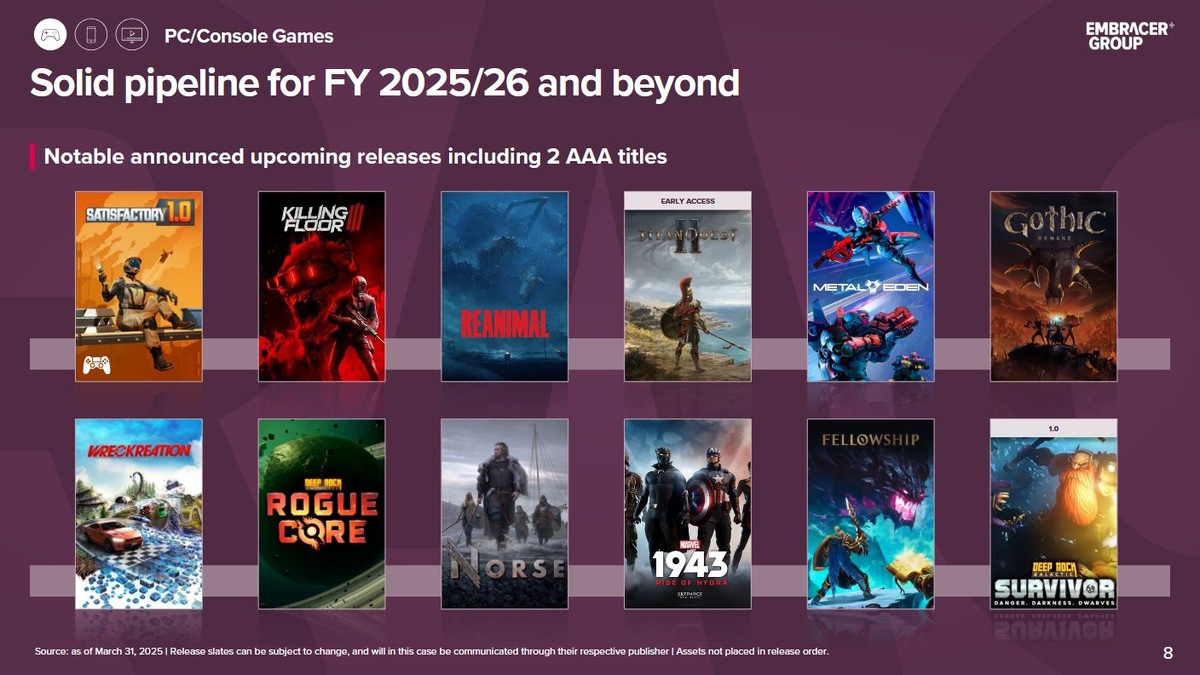 Когда речь заходит о Embracer Group, которая теперь называется Fellowship Entertainment, мы сразу говорит о конгломерате, в составе которого множество разных подразделений. Недавний кризис сильно ударил по компании, лишил её некоторых IP и партнёров, но многочисленные внутренние студии продолжают делать игры. Сейчас в планах у компании — релиз 76 тайтлов за финансовый 25/26 год, то есть с апреля 2025 года по конец марта 2026. 10 из них были опубликованы в прошлом материале, одна из которых — Killing Floor 3, сменившая дату релиза и запланированная на 24 июля. Fellowship Entertainment также рассчитывает, что сможет выпускать в год не по одному ААА-тайтлу, как было раньше, а по два. В этом финансовом году таких игры будет две: Killing Floor 3 и Marvel 1943: Rise of Hydra, а потенциальную третью перенесли на следующий год. При этом у компании есть планы на 2026/27 и 2027/28 финансовые годы, сейчас в разработку запланированы сразу девять ААА-игры, одна или несколько из числа которых могут