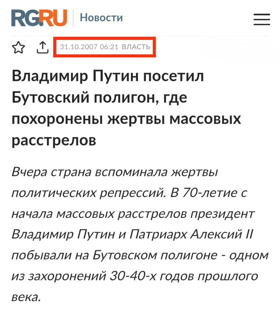 В тот год президент РФ посещал Бутовский полигон — одно из ключевых мест памяти о жертвах сталинских репрессий. Путин подчеркивал, что 1937 - год жестокости, события которого не должны повториться.