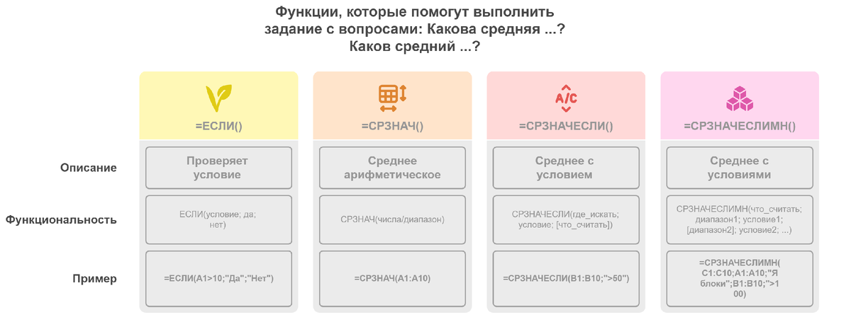 - СРЗНАЧЕСЛИ() — находит среднее по одному условию.