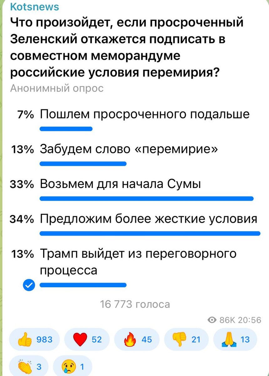 ⚡️⚡️⚡️ 34 процента проголосовавших считают, что мы выдвинем более жесткие условия. А подкрепят их наши военные успехи на земле.