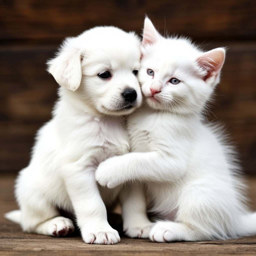 Белые друзья: История крепкой дружбы. В уютном загородном доме жила добрая женщина, которая очень любила животных. Однажды она принесла домой маленького пушистого щенка. Он был совершенно белоснежный, без единого пятнышка, и получил имя Пики. Щенок оказался невероятно игривым и требовал много внимания, что было неудивительно для его возраста. Хозяйка очень любила Пики, но часто была занята по хозяйству. Она понимала, что малышу одиноко, когда её нет рядом. Тогда она решила найти для щенка друга. Поговорив с сестрой, она узнала о маленьком белом котенке, который жил у той во дворе. Так в доме появился второй пушистый житель – спокойный и рассудительный котенок, которого назвали Куми. Удивительно, но окрас обоих малышей был абсолютно одинаковым – они были словно две белоснежные пушистые облачка. Сначала Пики очень обрадовался новому другу, но вскоре выяснилось, что характеры у малышей разные. Щенок постоянно носился по дому, предлагая котенку играть, а тот предпочитал спокойно отды
