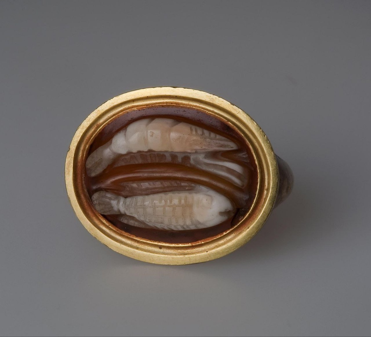 🐟 Камея "Рыба и креветка". Древний Рим, I в. н.э. Сардоникс и золото.
