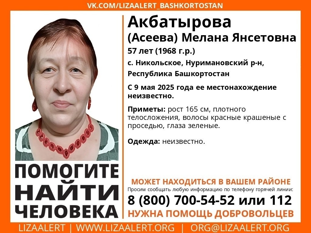 В Башкирии пропала 57-летняя жительница села Никольское Нуримановского района Акбатырова (Асеева) Мелана Янсетовна. С 9 мая 2025 года её местонахождение неизвестно, сообщает поисковый отряд «Лиза Алерт Башкортостан». Приметы: рост 165 см, плотного телосложения, волосы красные крашеные с проседью, глаза зелёные. Во что была одета – неизвестно. Контактный телефон 8-800-700-54-52 или 112.