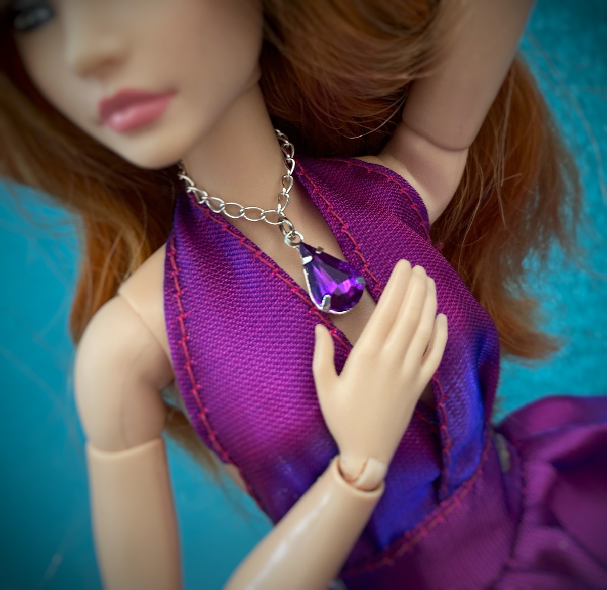 Следующее украшение вроде и простенькое на вид, но очень, на мой взгляд, удачное. Это небольшая подвеска в виде капельки насыщенного фиолетового цвета на тонкой цепочке. Изделие очень к лицу рыжеволосым куклам, но, поскольку Изольда уже успела поучаствовать в двух фотосессиях с украшениями (одну из них я еще не показала), то демонстрацию капли «под аметист» мы доверили нашей немногословной барышне Сигги. Она, кстати, сразу оговорила, что ничем «светить» в камеру не собирается, поэтому все должно быть умеренно и прилично. Да не вопрос, Сигги! Пробные кадры. Мне они самой не очень понравились, если честно. Это вообще была самая первая попытка сфоткать куклу с украшением, я здесь еще не совсем понимала, как это делать. Да и Сигги, которая обычно не вылезает из штанов, была какая-то скованная в платье. Потом мы подумали - почему бы не пофоткаться в кафешке? Там ей все уже знакомо, сядет за стол, возьмет что-то в руки (которые ей, похоже, некуда было деть, и они ей мешали), глядишь, что