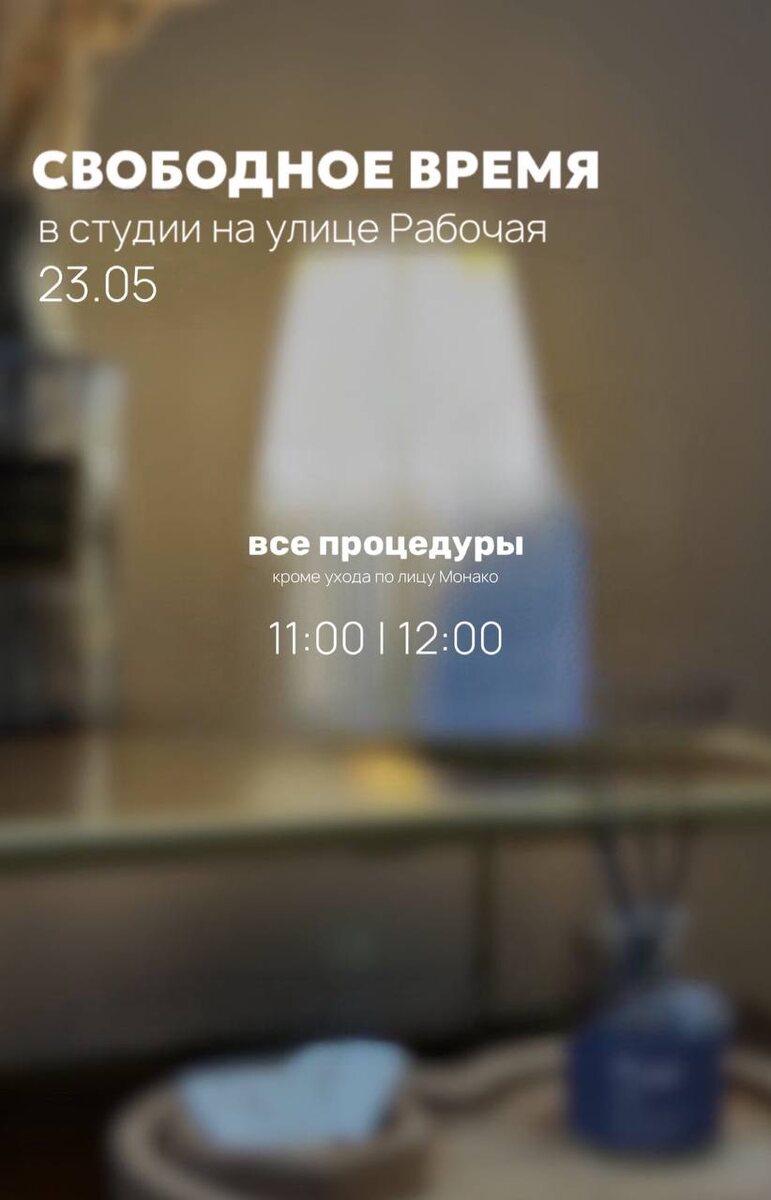СВОБОДНОЕ ВРЕМЯ НА РАБОЧЕЙ 23.05 • ONLINE запись • WHATSAPP Ждём вас к нам на процедуры 🤍