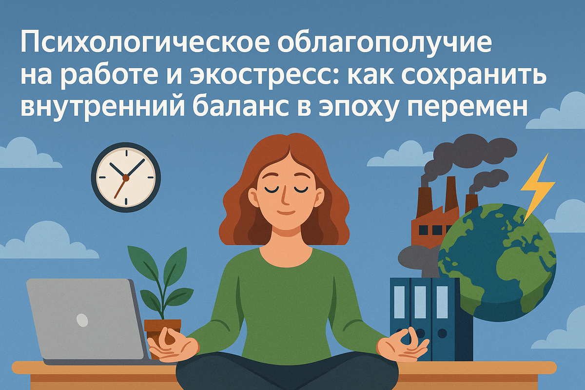 Современный человек большую часть жизни проводит на работе. Для одних — это источник вдохновения ✨, для других — постоянный стресс 😵💫, дедлайны ⏰, выгорание 🔥 и тревога. С развитием технологий и изменением климата к «офисным» стрессам добавилась новая нагрузка — экологическая тревожность, или экостресс 🌪️. Что это такое, как он влияет на наше ментальное здоровье 🧠 и можно ли сохранить психологическое благополучие на работе в таких условиях? Психологическое благополучие (или well-being) — это не просто отсутствие тревоги или депрессии ❌. Это более широкое понятие, включающее: Когда человек чувствует себя на работе спокойно 😌, уверенно 💪 и полезно 🛠️ — он работает продуктивно, меньше болеет 🤒 и дольше сохраняет мотивацию 🚀. Экостресс — это психологическая реакция на экологические изменения 🌡️: изменение климата, загрязнение окружающей среды 🌫️, вымирание видов 🐾, техногенные катастрофы. Уже более 70% молодых людей испытывают тревогу 😟, связанную с состоянием планеты 🌏. Эк